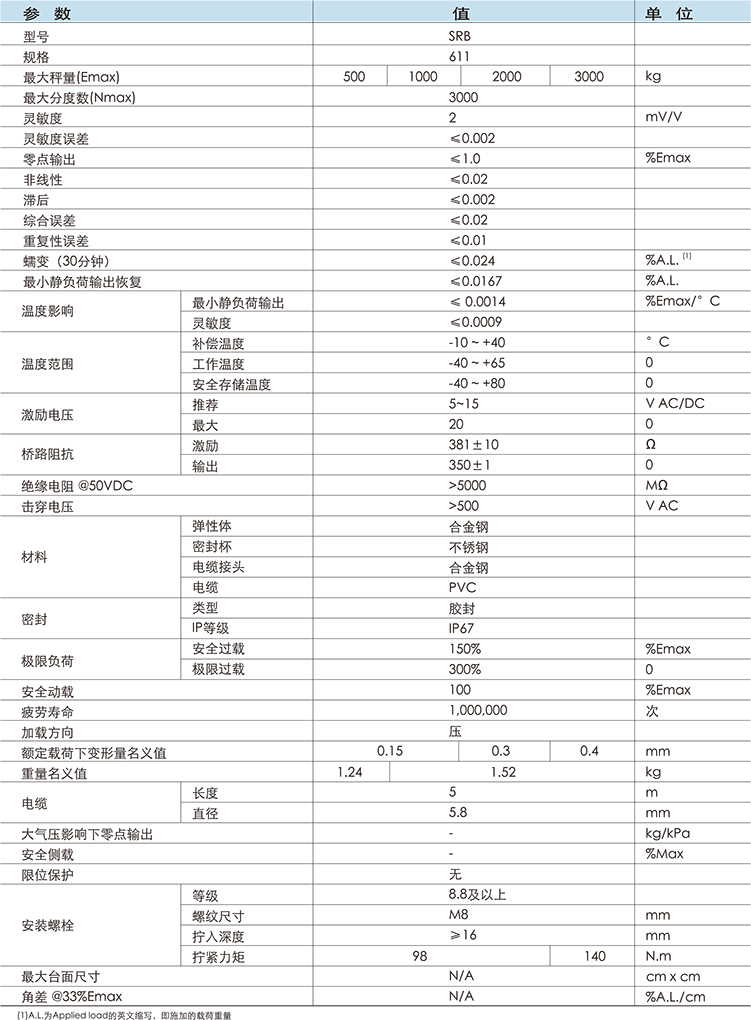 SRB611是一(yi)種適用(yong)于(yu)(yu)低臺(tai)(tai)面中小型平(ping)臺(tai)(tai)秤的(de)懸臂梁傳感器,防護等級IP68,適用(yong)于(yu)(yu)一(yi)般的(de)工業環境(jing)。
