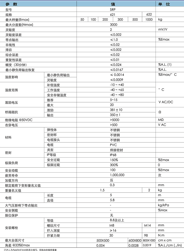 SRP621是(shi)不銹(xiu)鋼焊接密封的單點式(shi)傳(chuan)感器,主要用于(yu)不銹(xiu)鋼防水(shui)秤,適用于(yu)化工,食品(pin)以及制藥行(xing)業的過程(cheng)稱重。