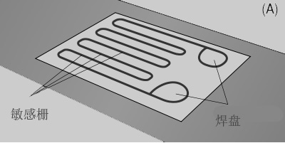 一個典(dian)型的應(ying)變(bian)片(pian),在敏感柵(zha)外(wai)部(bu)有(you)標記線,便(bian)于粘貼時應(ying)變(bian)片(pian)對齊(qi)所(suo)測應(ying)變(bian)方(fang)(fang)向(xiang),主(zhu)測試方(fang)(fang)向(xiang)為水平方(fang)(fang)向(xiang),沿著敏感柵(zha)長(chang)度方(fang)(fang)向(xiang)。